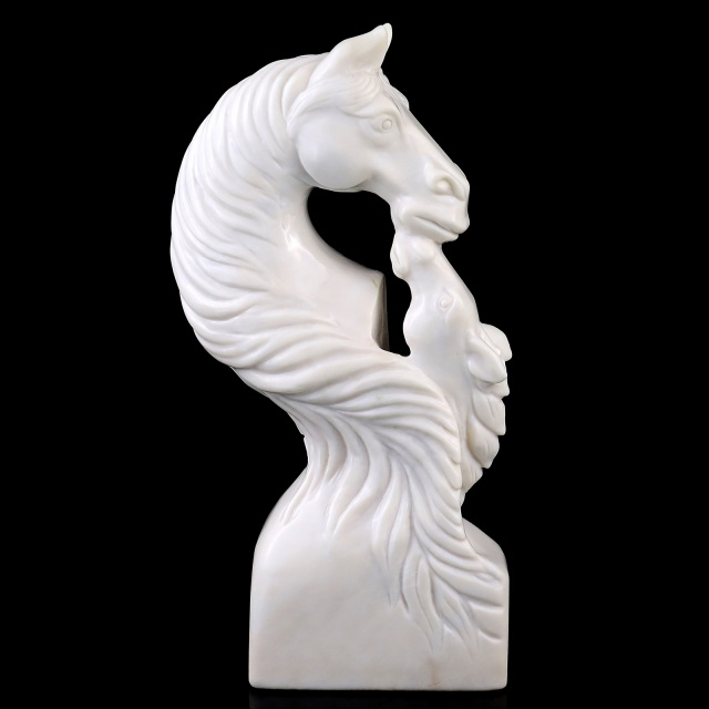 The horse, a timeless symbol of freedom, endurance, and strength, is beautifully represented in this sculpture. Its polished White Jade finish highlights the stone’s luminous qualities, while the detailed craftsmanship captures the spirit and power of the horse.