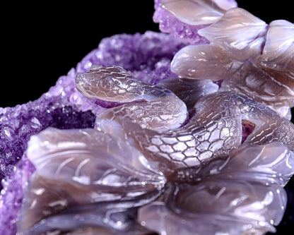 This exquisite animal sculpture is hand-carved from 100% natural Amethyst Druse Agate, a unique gemstone combination that blends the grounding properties of Agate with the calming, spiritual energy of Amethyst. The polished Agate body pairs beautifully with the sparkling Amethyst druse crystals, creating a piece that is both visually captivating and metaphysically powerful.