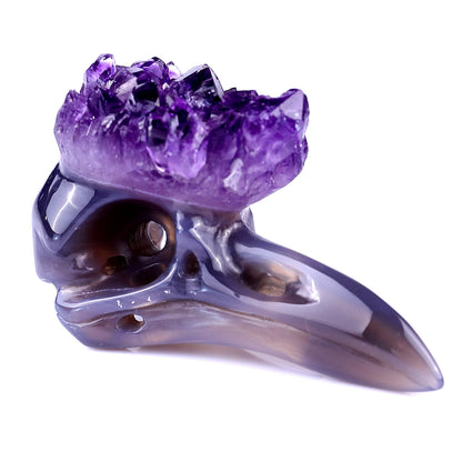 Features: Sparkling amethyst druse crystals, detailed raven skull design, unique natural patterns