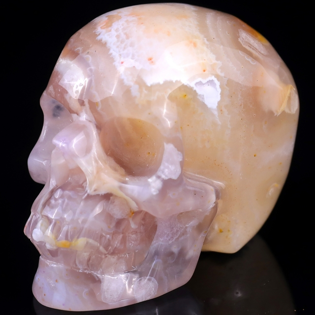 The agate's floral motifs symbolize renewal and hope, making this skull both a poetic natural artwork and a tender emotional healer.