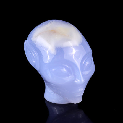The 2.9" Blue Chalcedony Elf Alien Skull is a captivating hand-carved gemstone sculpture that merges exquisite craftsmanship with the serene, soothing energies of 100% natural Blue Chalcedony. Known for its soft, translucent blue hues, Blue Chalcedony is cherished for promoting calm, clarity, and harmonious communication, making this sculpture as energetically potent as it is visually stunning.