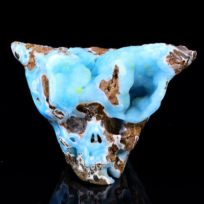 This Blue Aragonite Skull is a meticulously hand-carved mineral specimen made from 100% natural Blue Aragonite, known for its stunning oceanic blue tones and calming, high-vibration energy. Blue Aragonite is often associated with emotional healing, enhanced communication, and spiritual growth, making this sculpture a perfect blend of artistry and metaphysical value.