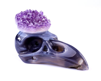 5.0" Amethyst Druse Agate Raven Skull – Hand Carved Natural Crystal Sculpture for Wisdom, Protection & Spiritual Awakening