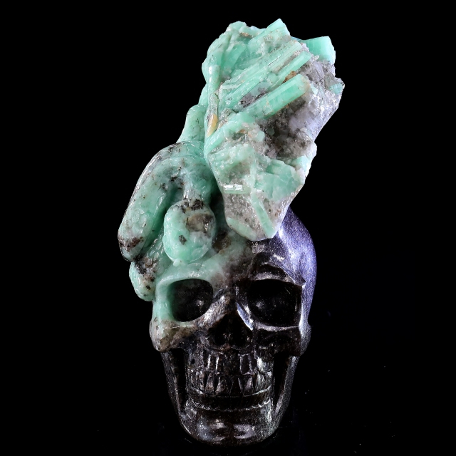 5.5" Natural Emerald Skull and Snake Sculpture, Handcrafted Gemstone Artwork for Collection & Decoration