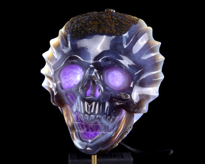 This extraordinary skull sculpture is carved from 100% natural Amethyst Druse Agate, a mineral specimen that combines the stability of Agate with the spiritual cleansing power of Amethyst. The polished exterior highlights the earthy strength of Agate, while the sparkling Amethyst druse crystals embedded within create a dazzling interior full of natural energy.