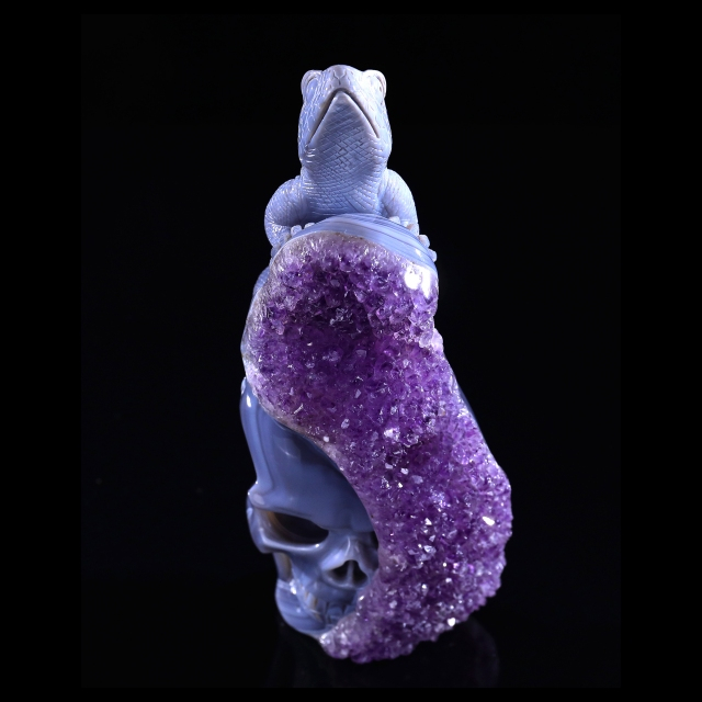 7.9" Amethyst Druse Agate Skull & Lizard Sculpture, Natural Crystal Gemstone Artifact for Luxury Decor