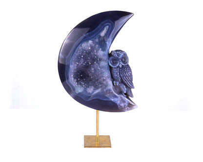 8.2" Quartz Rock Druse Owl with Moon Hand Carved Crystal Sculpture