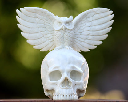 8.9" White Jade Hand Carved Crystal Skull and Owl Sculpture