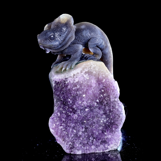 Amethyst Geode Agate Hand Carved Crystal Lizard Sculpture – Healing Stone Animal Figurine