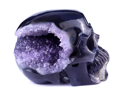 This 6.9-inch Geode Agate Crystal Skull is a striking combination of natural geological beauty and skilled gemstone artistry. Carved from 100% natural Geode Agate, this sculpture showcases an incredible balance between the smooth polish of the skull and the raw, sparkling geode cavity, revealing shimmering quartz crystals within.